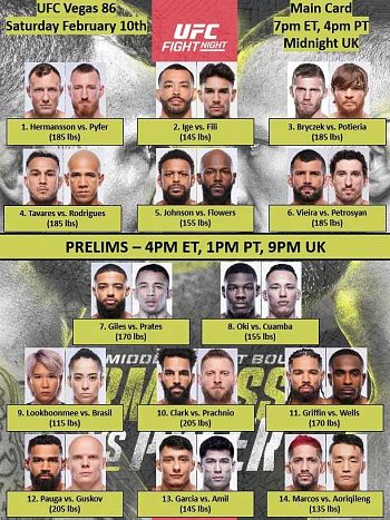 UFC Vegas 86 (UFC Fight Night 236) will take place on the night of February 11 in Las Vegas, Nevada, with Joe Pyfer vs. Jack Hermansson in the main event.