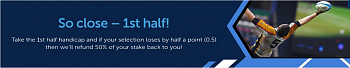 With the Sunbet so close-1st Half Bonus, you can get a 50% refund of the total stake amount if your selection on a rugby match loses by by half a point (0.5).