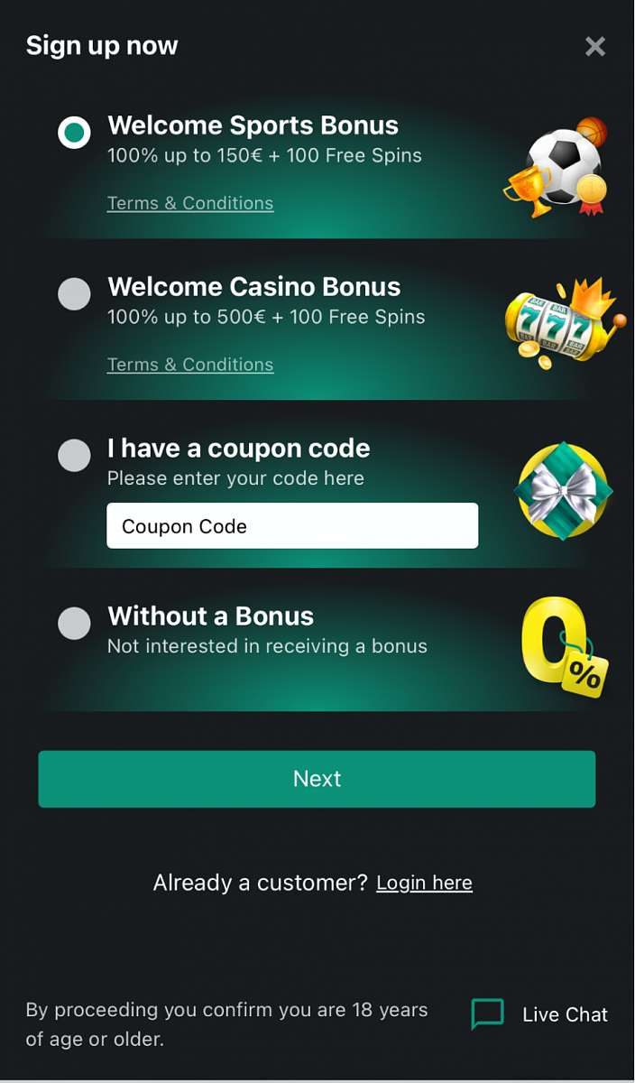 - Enter any bonus code in the Promotions/Campaigns area during registration.