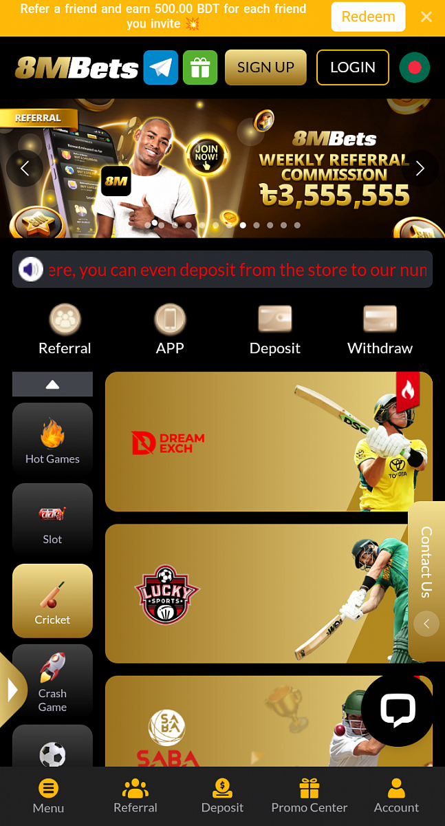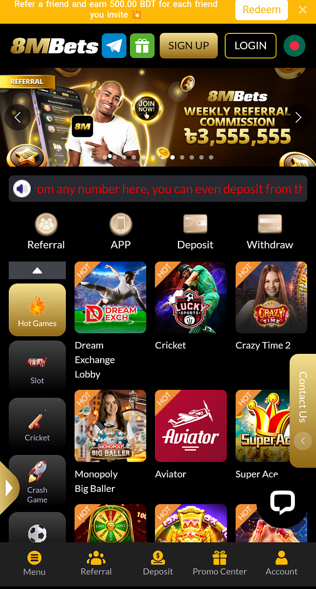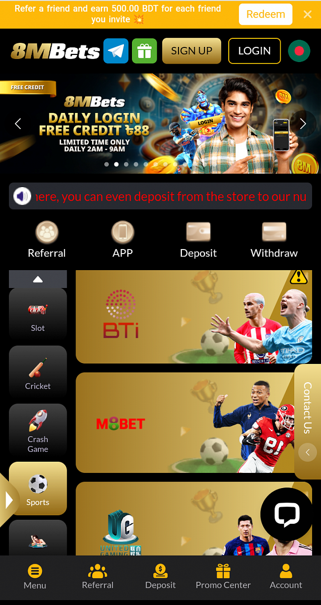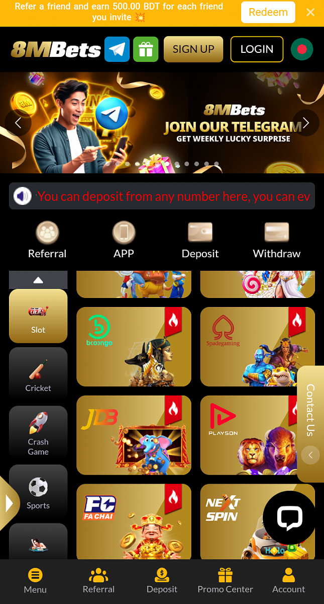 As a casino and sports player on the go, its great to see 8Mbets create bonuses for both casino and sports betting accounts on the app, allowing me to choose which one to claim. With both options available to new members, its a matter of choosing the bonus you want because you can only choose one. If sports betting is your thing, you can select the 100% welcome bonus on sports where you can claim extra sports betting credit for your cricket or soccer sports bets. For casino lovers, there is a 100% welcome bonus on slots that awaits you. To receive the bonus, you must first make a 500 BDT minimum deposit before you can begin playing slot games like Fortune Bull, 25 Coins, and many others.