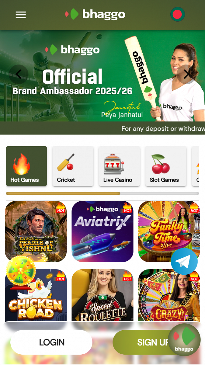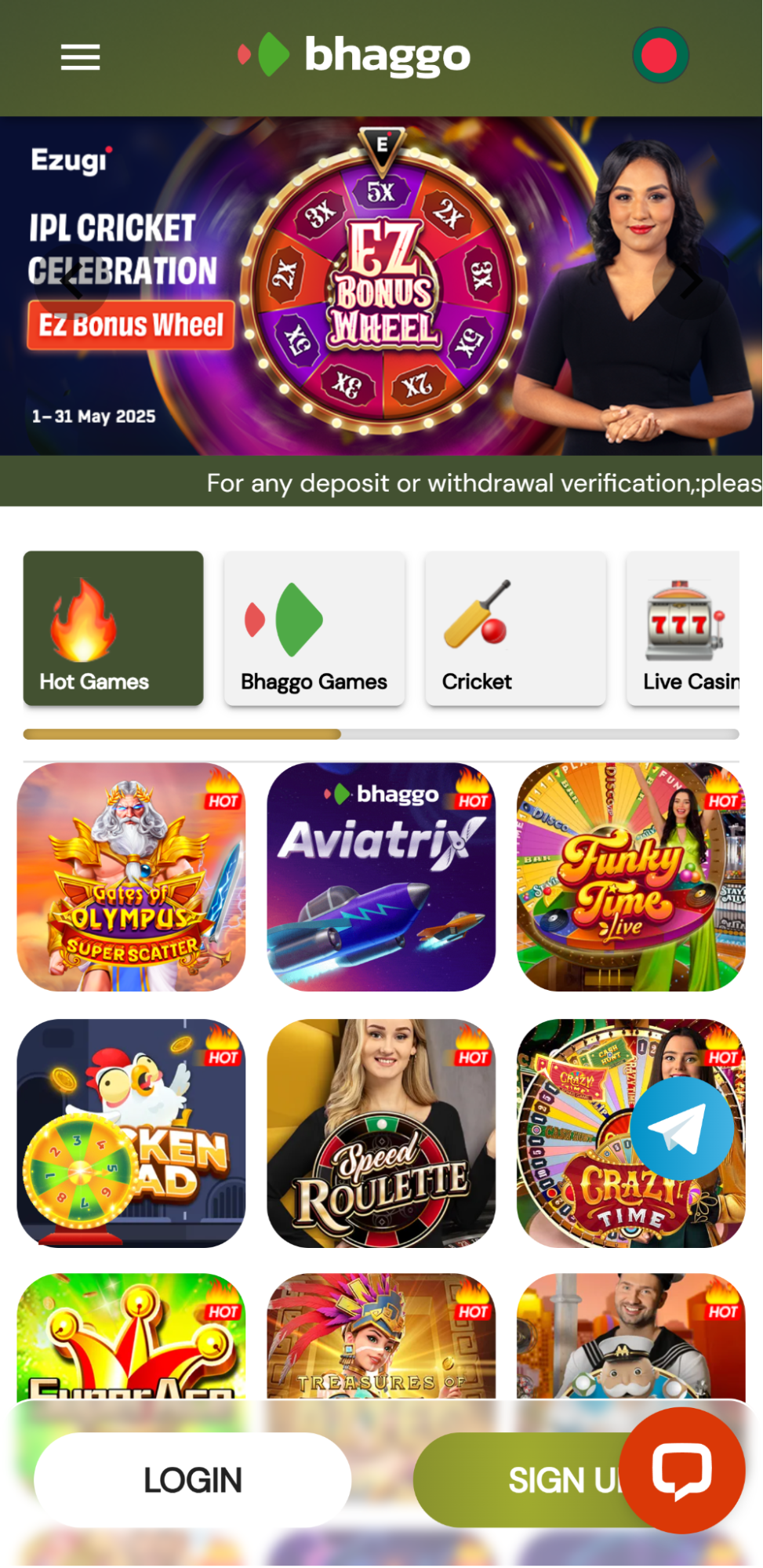 The bonuses don’t stop there. First-time depositors also get an Instant Deposit Bonus. Just deposit ৳1,000 or more, and you’ll score 10 free spins (worth 26 BDT each) and 5 free bets (50 BDT per Bhaggo bet). Alongside it, you also get a free 100 BDT shot at Crazy Time. These are spread across selected slots and crash games, minus some table games and betting.