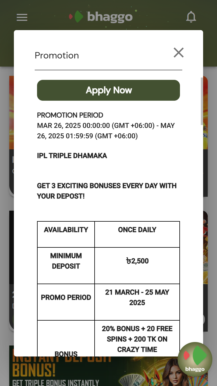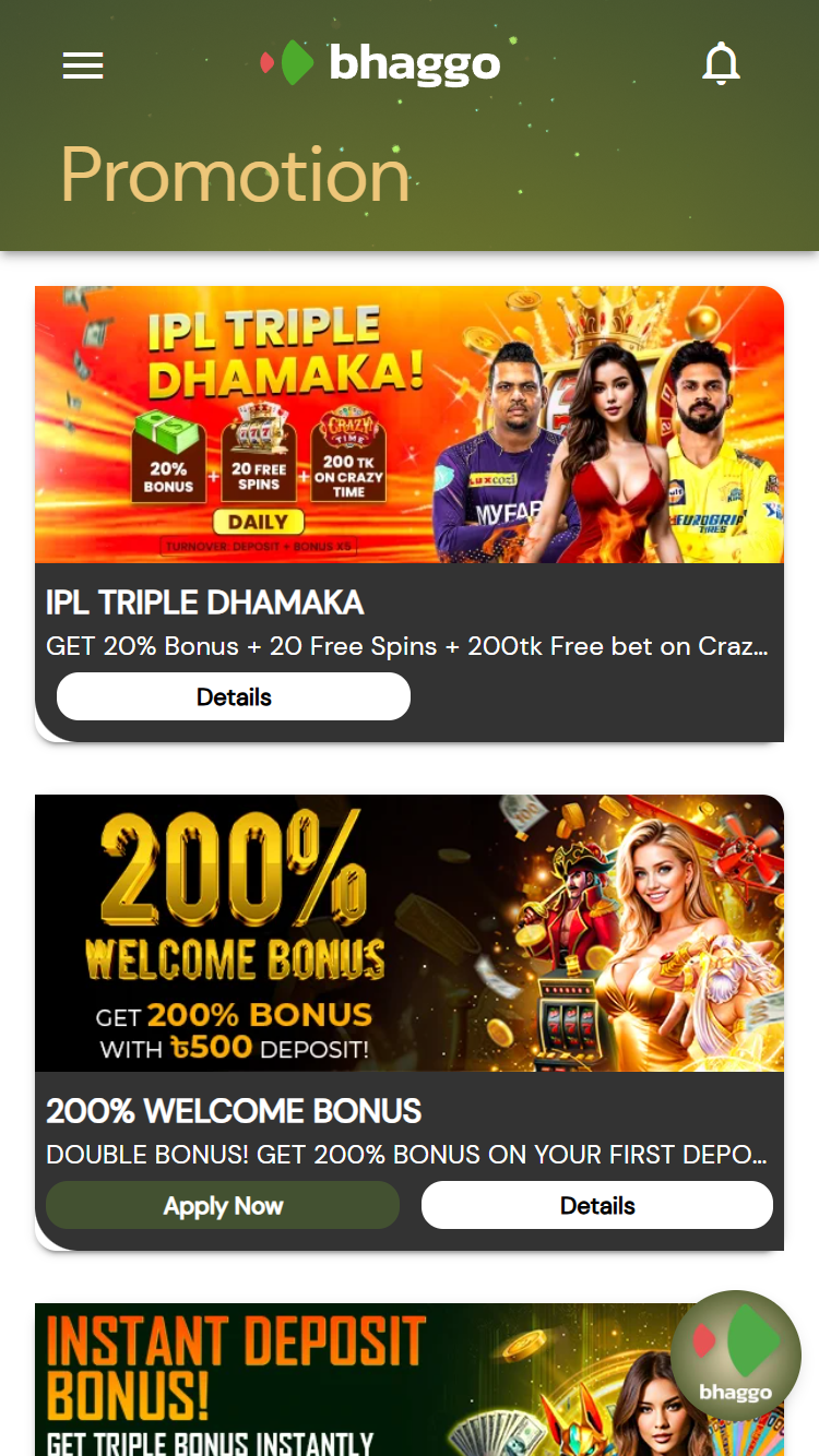 Now, if you’re more of a slots or live casino enthusiast, Bhaggo throws in another generous 200% Welcome Bonus up to ৳1000. This becomes valid on your very first deposit of just ৳500. That’s not something you see every day, but note that this bonus can only be claimed once. Also, the wagering requirement sits at a reasonable 15x your deposit and bonus combined. Again, keep an eye on that excluded games list before you start spinning.