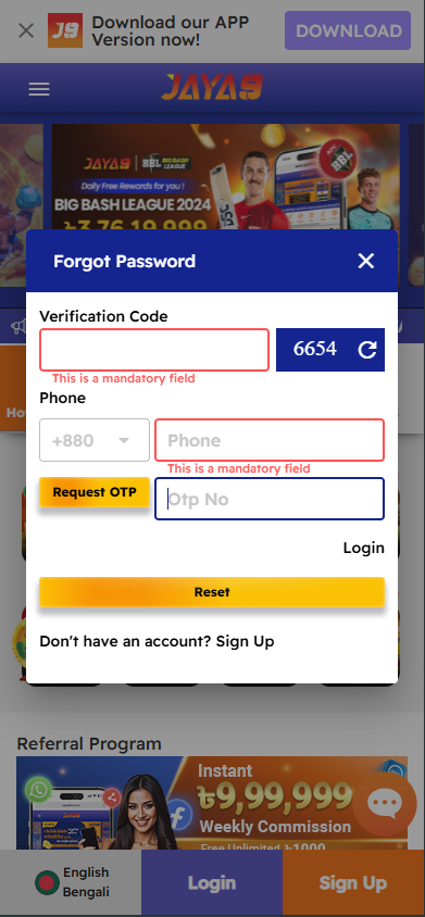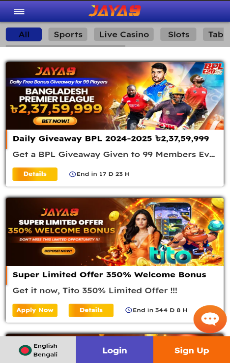 Jaya9 BD.com offers a 20% Weekly Reload Bonus of the total amount deposited by players of up to ৳25,000. This sports bonus raises the bar of attractiveness and appeal of the platform considerably for those players who have a passion for betting on numerous sporting events.