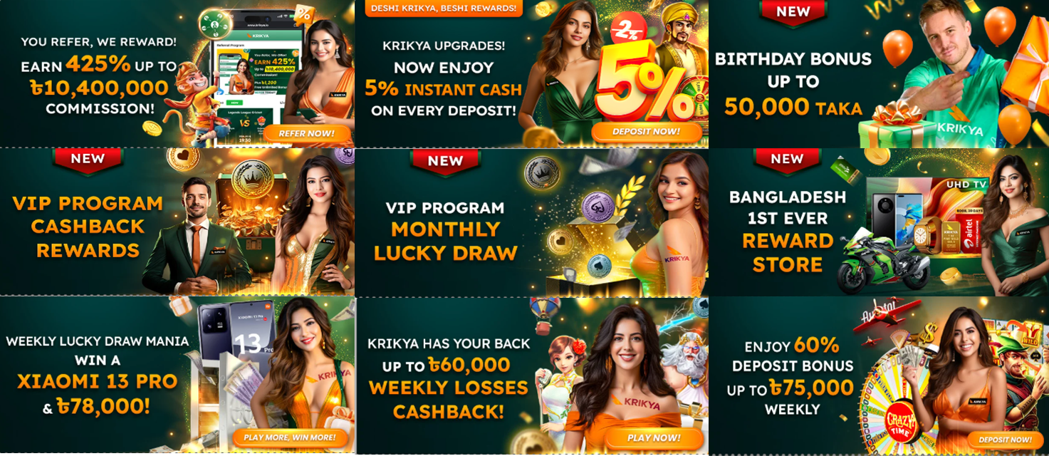 Referral Bonus: You can earn 425% up to 10400000 BDT and 1200 BDT free unlimited bonus by referring friends to the Krikya online betting platform.