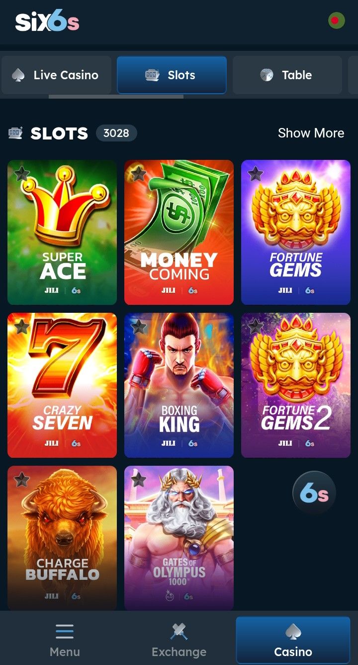 A huge 3000+ games come with Six6s download for Android. There are 2000+ slots with a variety of themes available for gamers. Some of the games are Boxing King, Crazy 7, Elemental Link Fire, Jungle King, Fruity Bonanza, Crazy Buffalo, and Treasures of Aztec.