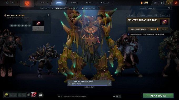 The seasonal winter treasure can be purchased for shards. It's only available to Dota Plus subscribers and contains new sets for Spirit Breaker, Chaos Knight, Riki, Treant Protector, Arc Warden, Undying, and Lina. With each open treasure chamber, you have a chance to get a very rare Bionic Birdie courier, which has two gems at once: colorful and kinetic. Let's look at each of the new sets and try to assess how good each one is.