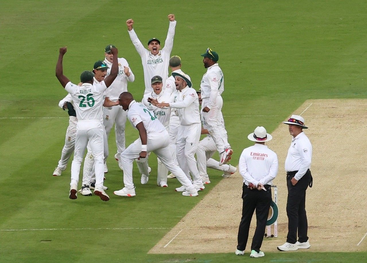 South African players celebrate a wicket. @ICC