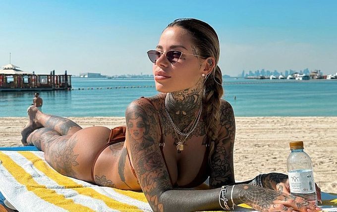 Of course, many advertisers and photographers are attracted not only by her sexy figure and beautiful features, but also by her countless tattoos. They give Zoe a special charm. Tattoos cover 60% of her body. There are flowers and symbols on her neck and arms, a beautiful triangle with the words "Music Passion" on her right forearm, and an ethnic round tattoo that covers part of her thigh.
