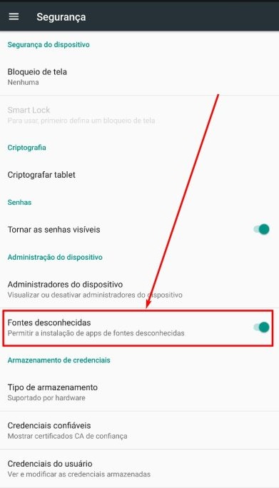 - Abra as configurações do seu aparelho. Encontre a categoria ‘Segurança’. Habilite a opção ‘Fontes desconhecidas’ para poder instalar o app sem qualquer dificuldade.