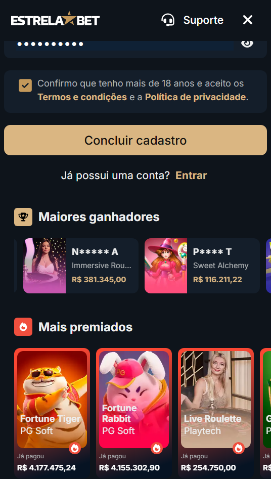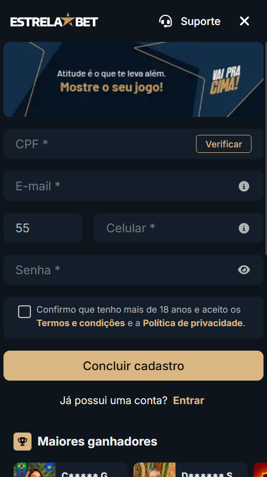 A versão mobile da Estrela Bet é bem simples e rápida de ser utilizada e o registro dela tem um passo a passo fácil para novos jogadores.