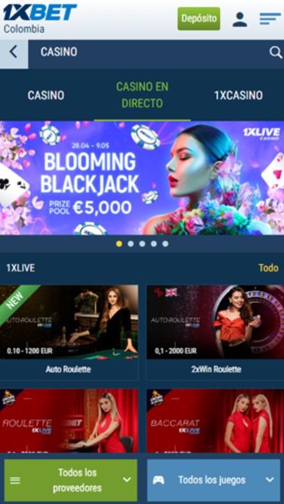 Se muestra la sección de casino, casino en vivo y 1xbet casino