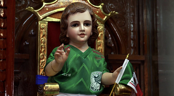 Desde el inicio de la pasada Copa Mundial de Fútbol de Qatar 2022, la imagen del Santo Niño ataviado con el uniforme de la selección mexicana ha capturado la atención en redes sociales. Vestido con un short y una playera verde, adornado con la bandera de México y con un balón a sus pies, esta representación única ha resonado entre los seguidores del equipo nacional. Sin embargo, para los fieles de la parroquia, como lo enfatiza en una entrevista a un medio mexicano la sacristana Ernestina Volado, esta figura es ante todo una representación sagrada de Cristo, que en épocas de Mundial adopta la vestimenta futbolística como un gesto de apoyo simbólico.