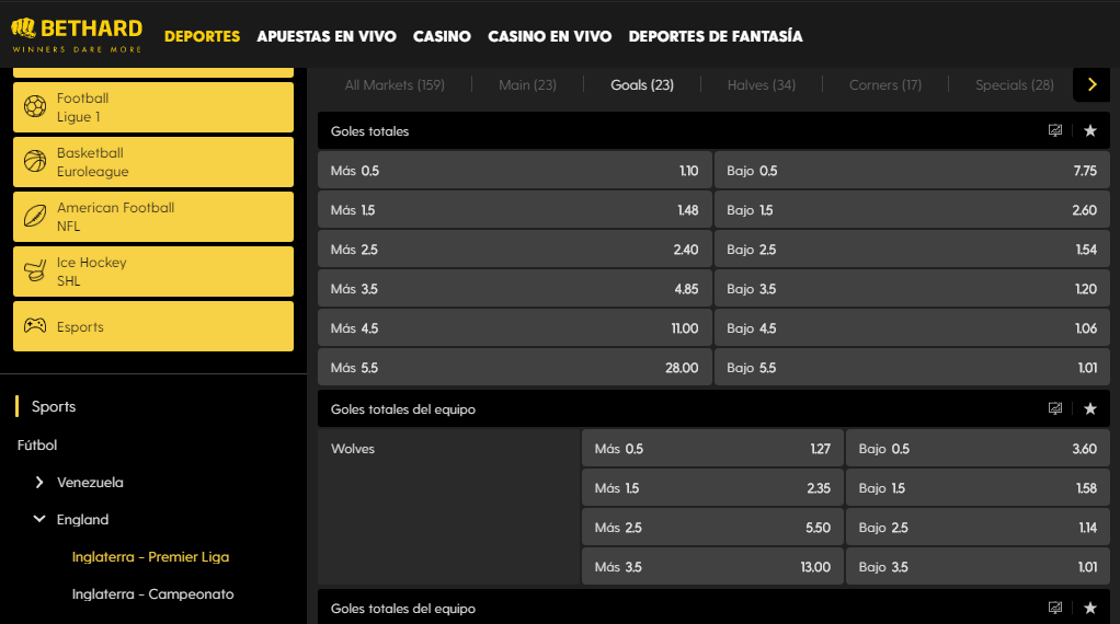 Casa de Apuestas Bethard divide las apuestas online en dos (2) secciones que van en todos los deportes y una o dos secciones adicionales que dependerán de cada disciplina: