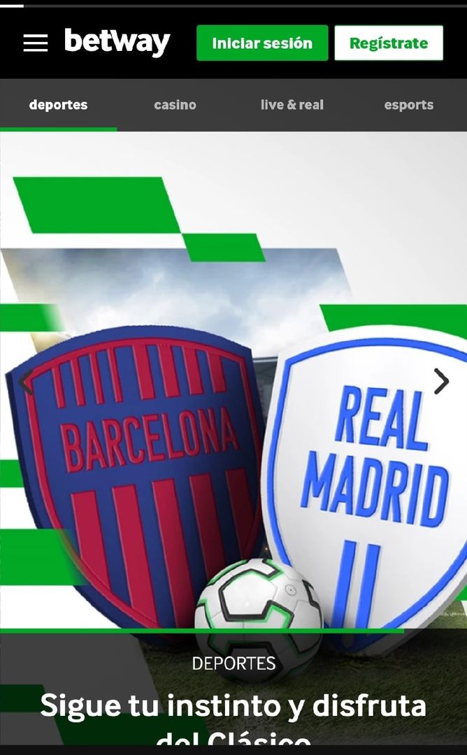 La página principal de Betway es fácil de usar y cuenta con un acabado profesional. La paleta de colores utilizada es agradable a la vista y está organizada en 4 categorías principales. Cada una redirecciona a un apartado en específico: