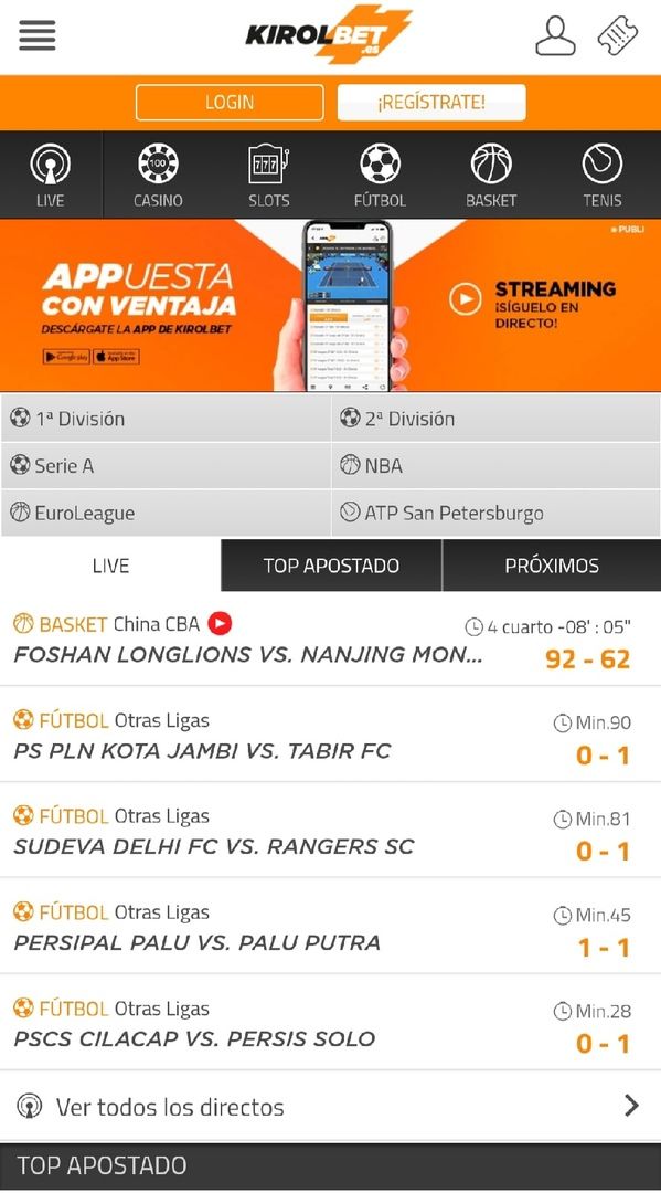 La plataforma online de Kirolbet es fácil de usar e intuitiva. La línea anaranjada horizontal en la parte superior de la página es para el registro de nuevas cuentas y el login de usuarios que ya son miembros. La línea negra bajo de la anaranjada es la lista de deportes y juegos disponibles en la casa de apuestas Kirolbet. En la página principal de Kirolbet, los usuarios pueden ver las promociones, los bonos y el link para descargar la app.