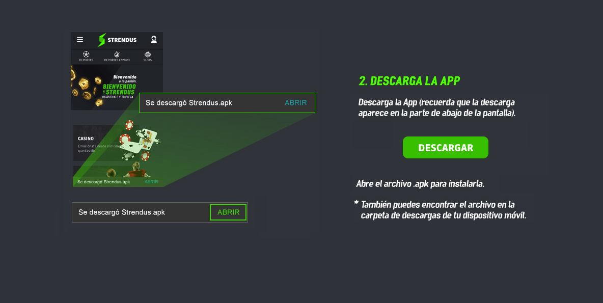 En el menú principal aparecen varios menús que dan información sobre las diversas alternativas de apuestas que ofrece Strendus: los distintos deportes disponibles, el casino, fantasy, bingo, slots y hasta sorteos, entre otras. En el caso de las apuestas deportivas, estas cuentan con diversas transmisiones en vivo para varios partidos. En la aplicación uno puede recibir varios bonos, la app oficial es muy simple, rápida y efectiva.