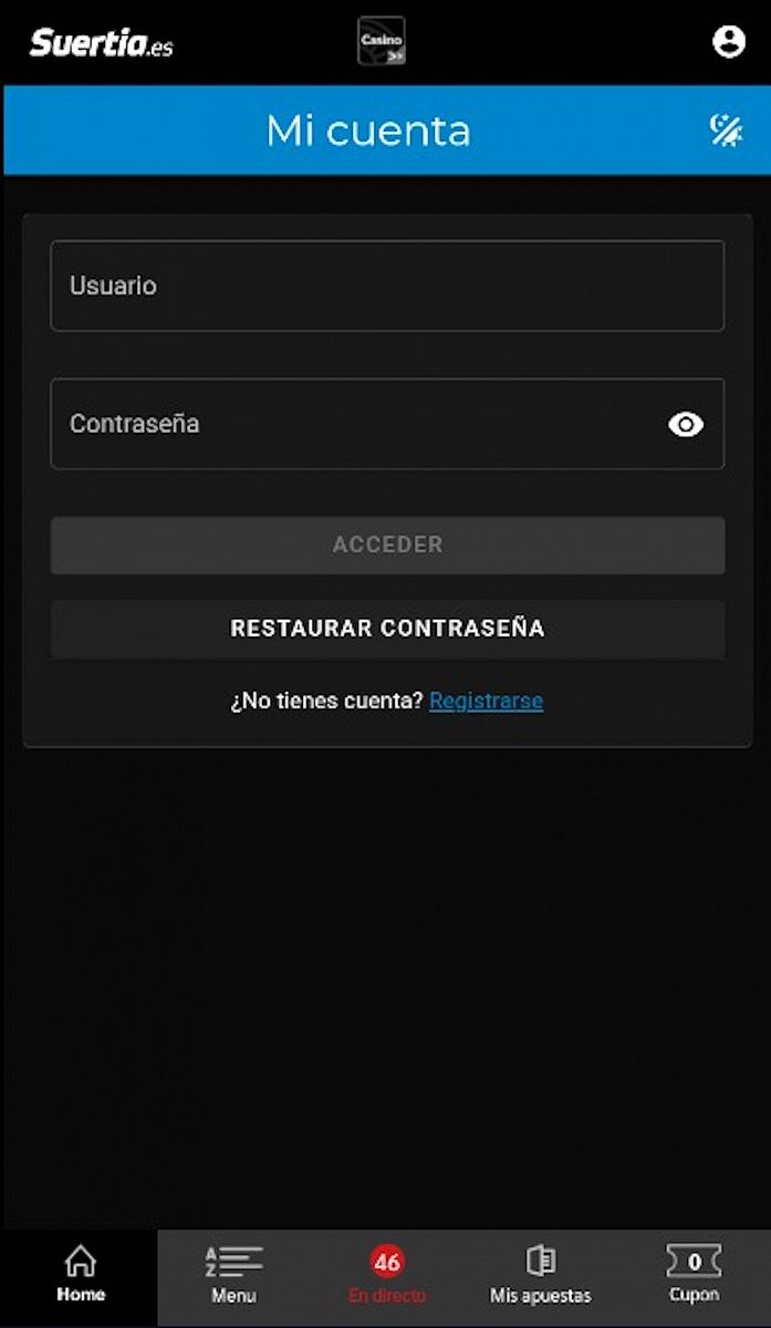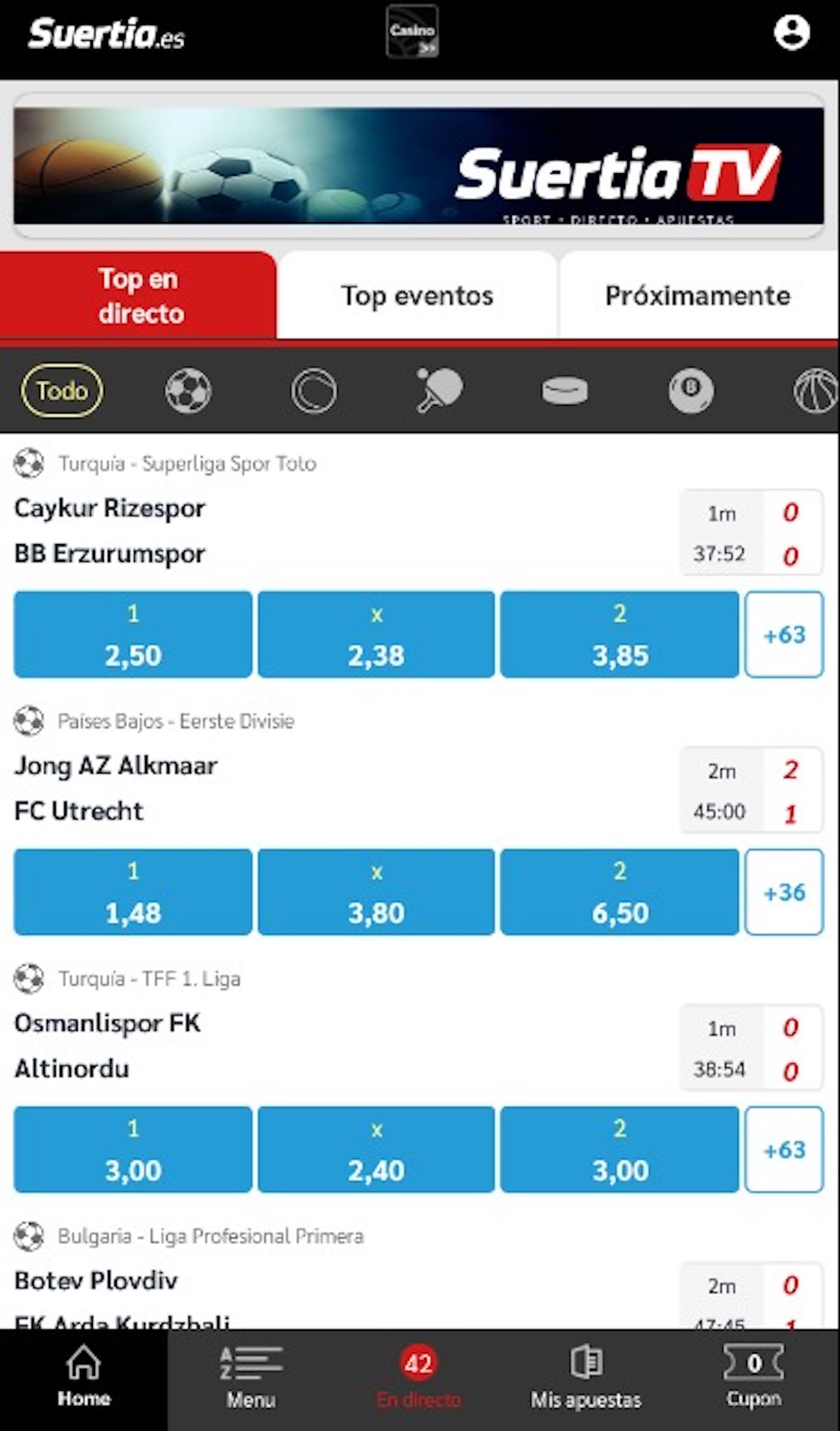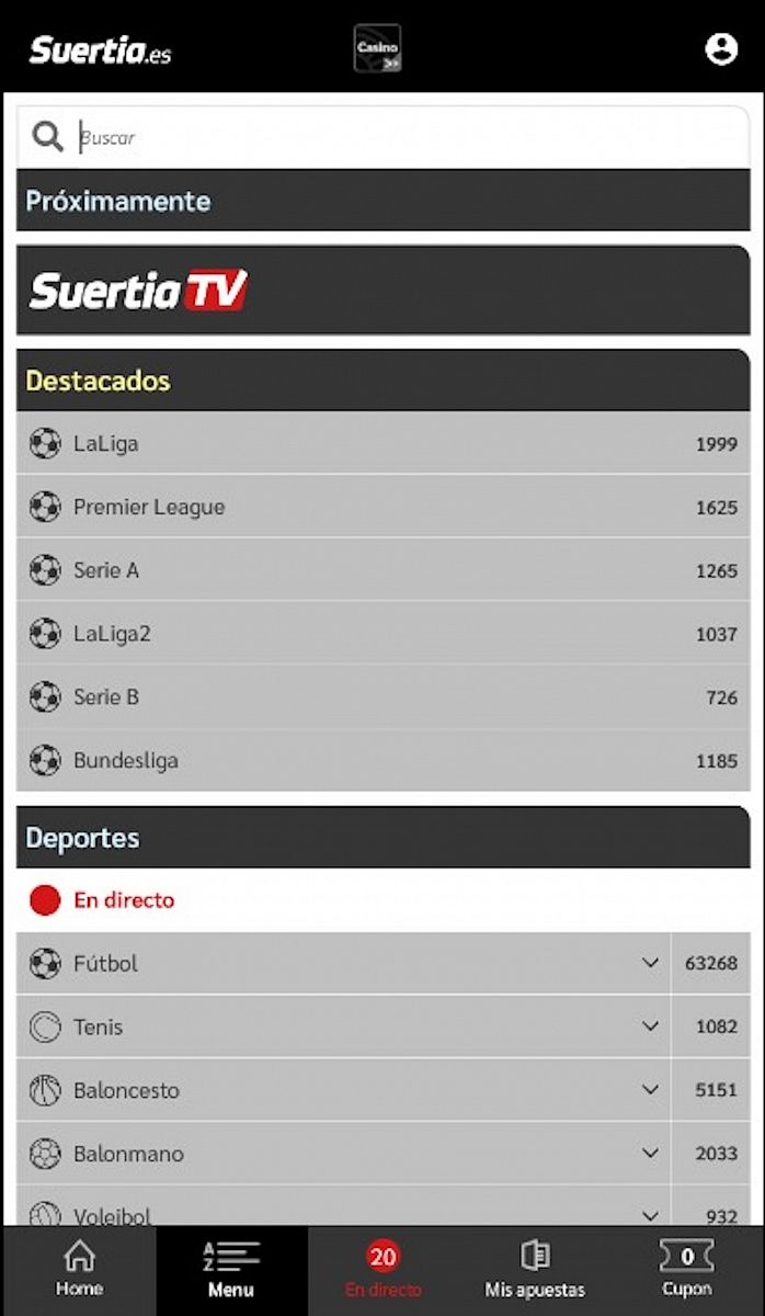 Dentro de la app se contemplan los eventos más importantes, todas las ofertas deportivas de Suertia, encuentros en vivo, tarifas de juego, cupones, apuestas y mucho más.