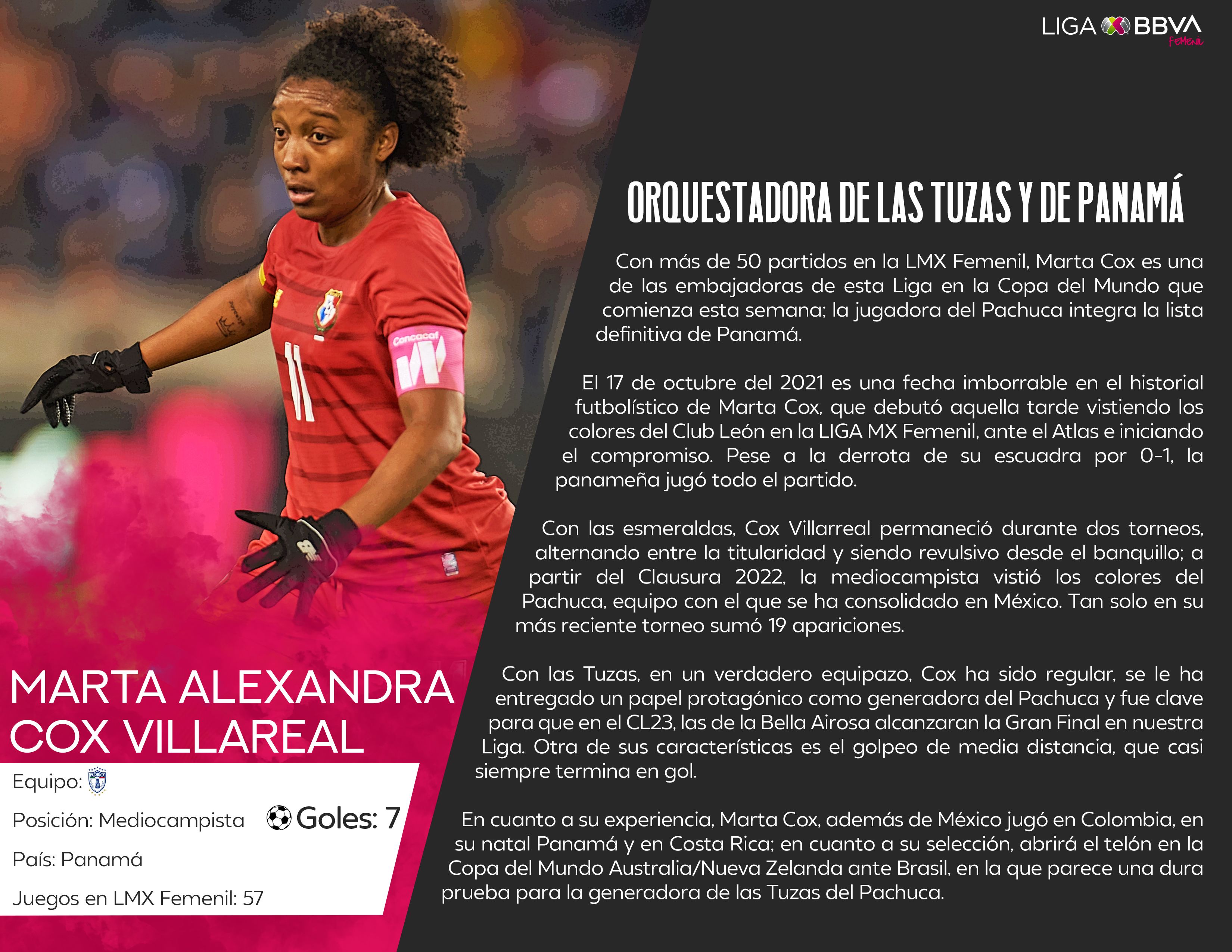 De la misma forma, Panamá tendrá entre sus filas a Marta Cox, jugadora de las Tuzas, quien al igual que su compañera Hermoso, se han convertido en grandes referentes de la escuadra hidalguense y del fútbol mexicano.