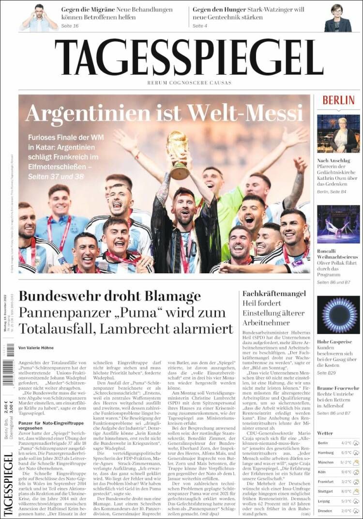El diario Tagesspiegel, que es de circulación local pero con impacto a nivel nacional, destaca en su portada la imagen de Lionel Messi con la túnica que recibió de parte del emir, levantando la copa del mundo.