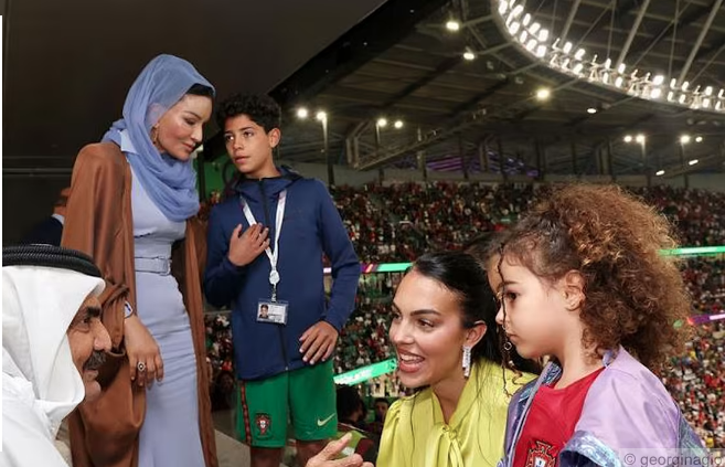 Las famosas WAGS (Wives and Girlfriends ) también han tenido la oportunidad de codearse con esta millonaria, pues Georgina Rodríguez, la famosa influencer, empresaria y pareja de Cristiano Ronaldo, se reunió con la ex jequesa durante un partido de fútbol, donde incluso los hijos del astro portugués, tuvieron una plática con Moza así como con su esposo, el ex emir.