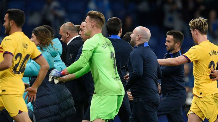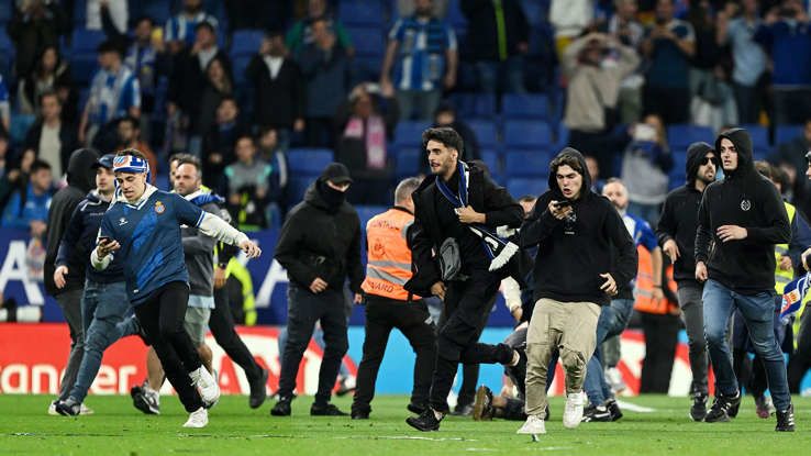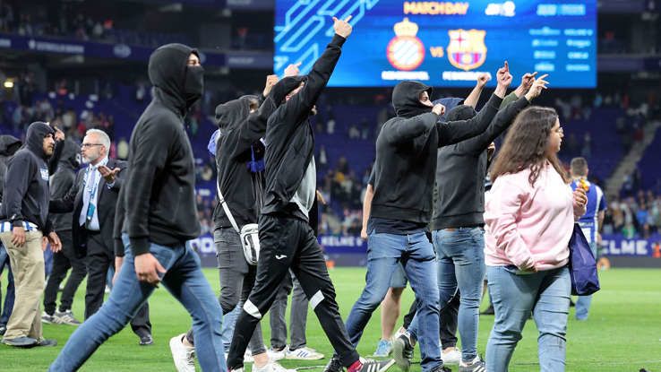 Terminado el compromiso entre el FC Barcelona y el Espanyol, en el RCDE Stadium, aficionados 'periquitos' invadieron el campo de manera agresiva. Los jugadores del Barça tuvieron que correr escoltados hacia los vestuarios.