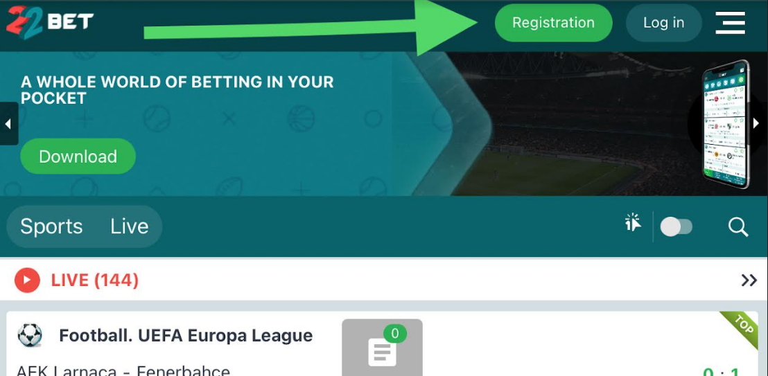 22Bet registration can be done without lifting a lid. Just surf the internet visit the 22Bet online sports website, and use the Registration menu button.