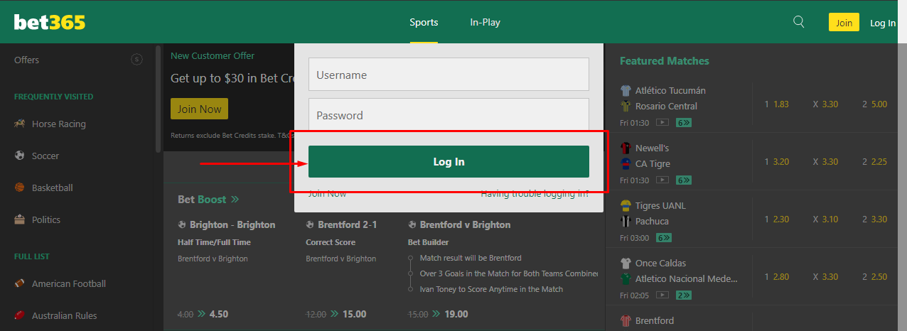 On the pop-up login form, kindly input or type in your username and password to access the Bet365 Ghana sports betting site.