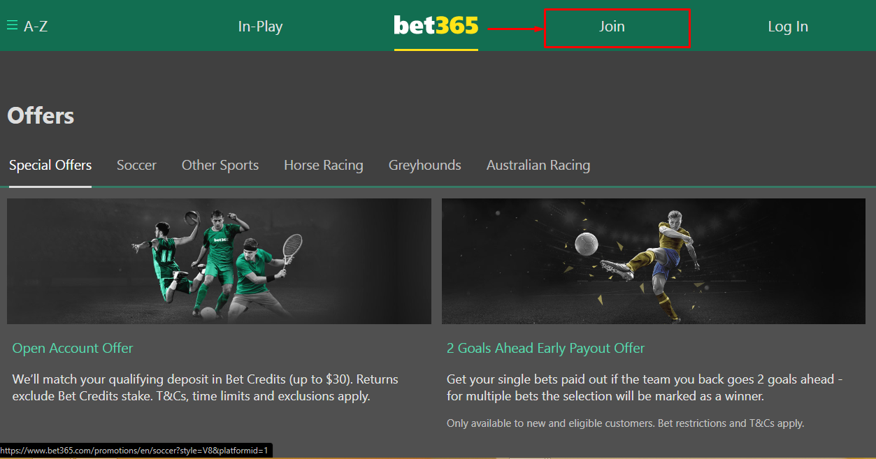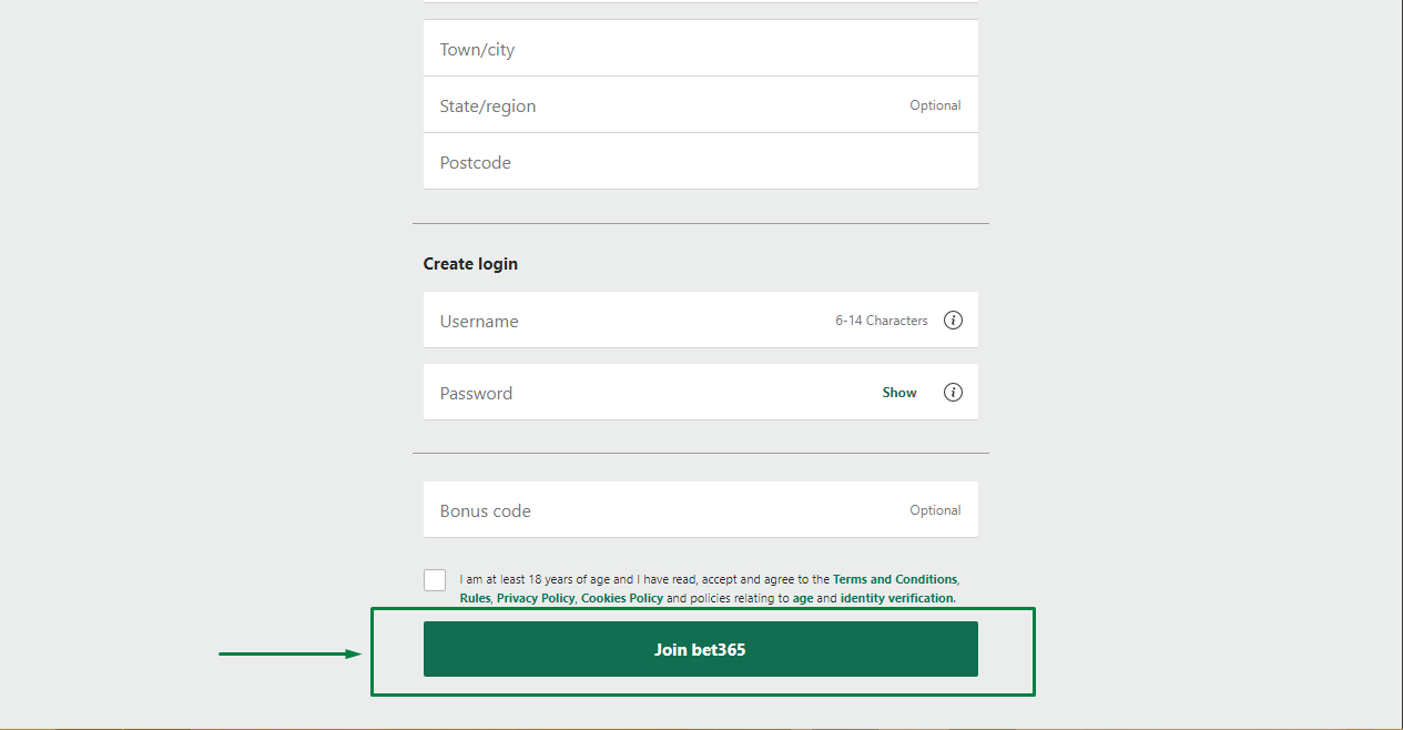 - Accept the rules and regulations, and proceed by clicking the "Join Bet365" menu button;