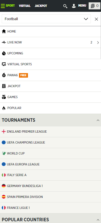 With its user-friendly and uncomplicated platform, it is reasonable to assume that BetPawa's online sports betting site delivers a straightforward but entertaining experience. Also, the contemporary layout of the website is simple, with a white background, black text, and a few colored additions, predominantly green because that color is used for their branding. You can choose a sport from the desktop menu on the left to view all of the countries and events that are offered in that sport.