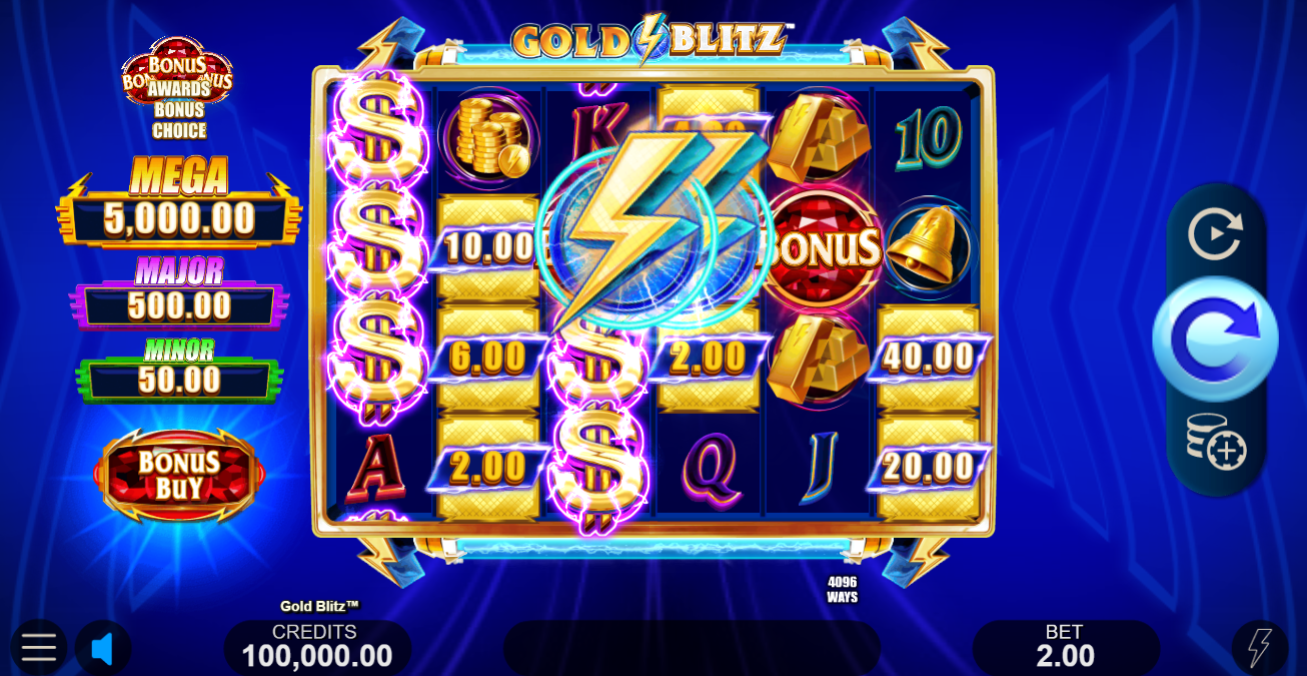| Gold Blitz | 6/4096 | Lightning bolt symbols gives total value displayed on landing on one or more |