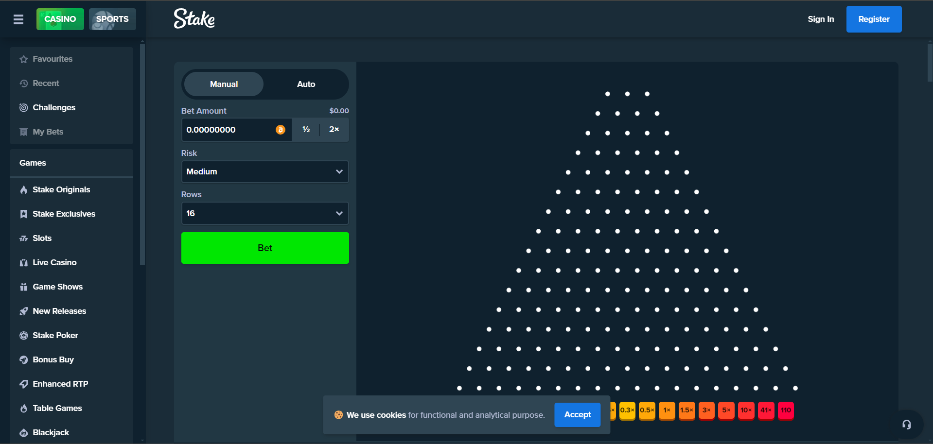 Stake is another popular casino in India where players can try their luck on the Slot game and win real money. The casino lacks a application, but the website version is way ahead in enhancing the enjoyment of the punters. While there isn’t any individual welcome bonus for new players in the casino, there are various other bonuses available. The casino has only Plinko m-Bit as a Plinko game on its platform.
