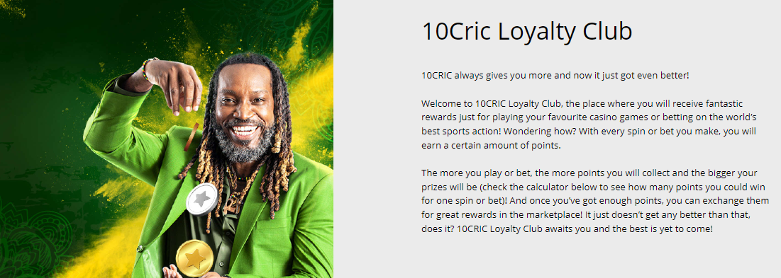 Staunch bettors of the 10Cric online sportsbook are regarded as VIPs, and to show appreciation for their loyalty, a VIP reward is set aside for them to earn points when they place bets, and to purchase numerous gift packages. Once you start betting on sports or playing casino, you start collecting Loyalty Points. You can use the Points Calculator to check how many Loyalty Points a certain bet will get you. Depending on how much you deposit and how much you wager, you will receive various rewards: