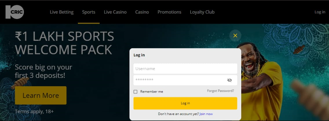 If you have attained the legal betting age of 18 years, go ahead and open the 10Cric online sports betting platform, and activate the Join Now menu tab.