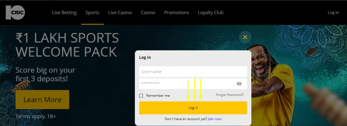 As long as a punter fulfills the age requirement as stipulated by the 10Cric sportsbook, they can proceed by visiting the 10Cric account page India website from their device's native browser and follow the process after clicking the "Login" button.