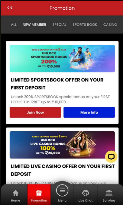 At 12Bet you will get a 100% sign-up bonus on your first deposit up to INR 20,000. All you have to do is sign up for an account, make a deposit and click on the Claim Now button. Once you claim the bonus, you should see it successfully added to your account.
