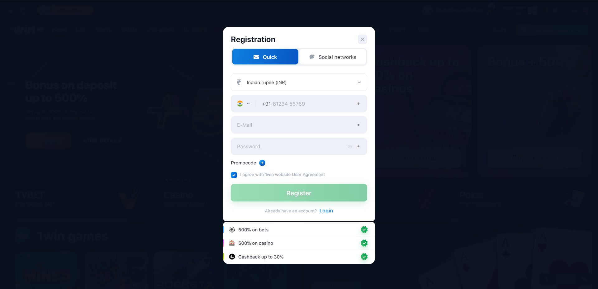 Upon clicking the registration button from the 1win homepage, you can find the page for entering your details. There is a quick registration option, and another one is using social networks. For the quick registration, you need to enter your phone number, registration email and password and then register. For social networks, you can directly register your account using the social network handles;
