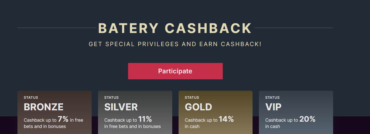 Batery betting site also features a loyalty program for the loyal punters on the website. The bookmaker has four different tiers: Bronze, Silver, Gold and Vip. The more you play, the higher the status you claim. The minimum bet amount for each level increases along with the cashback. The loyal players on Batery betting site can gain enormous rewards through the loyalty program.