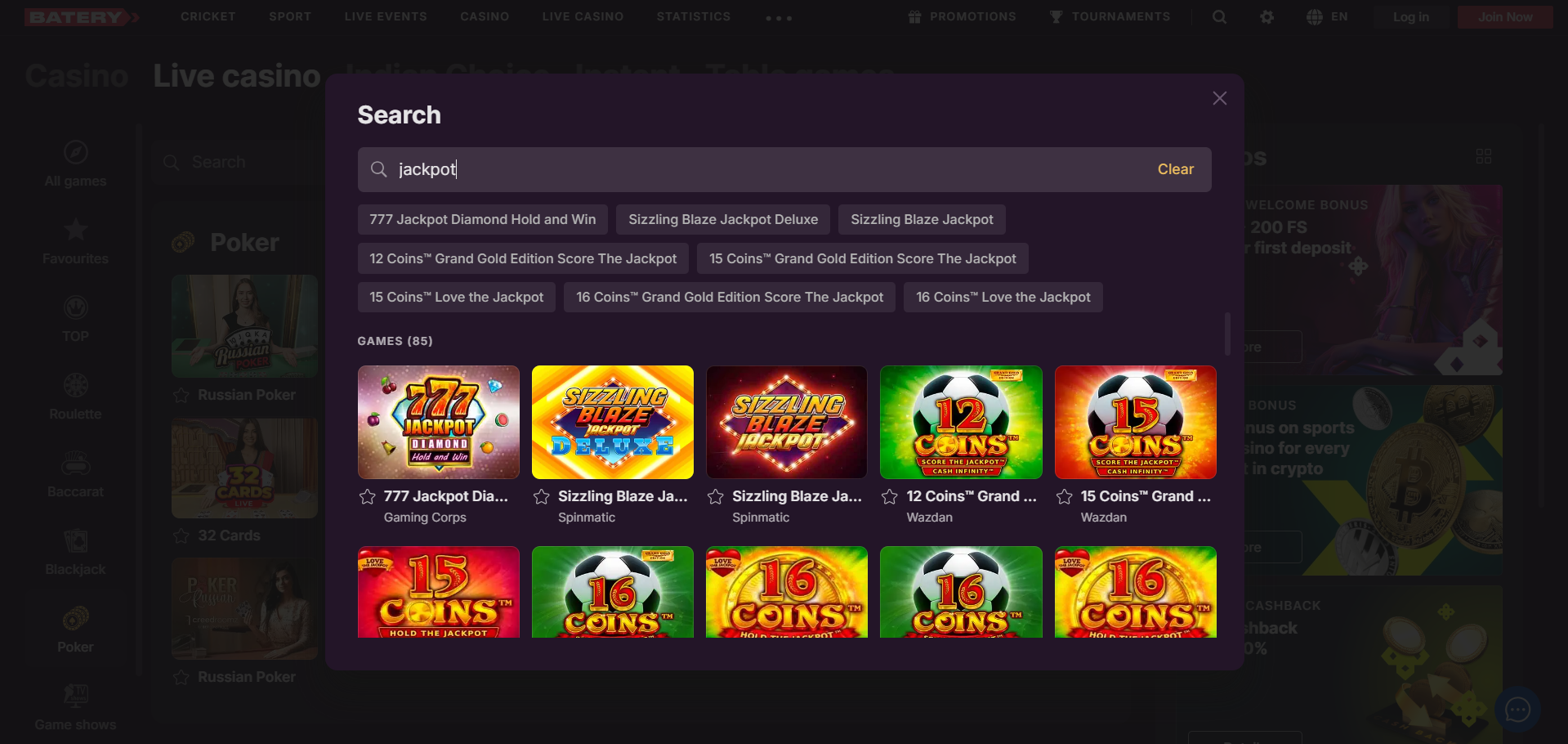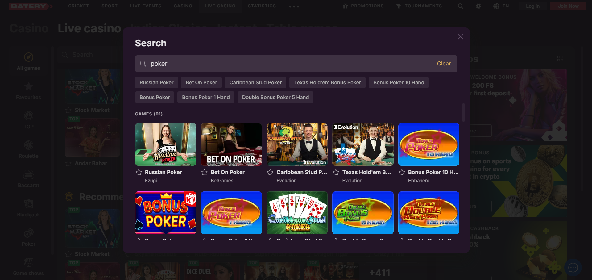 There are different varieties of Poker games available on Batery. There is a live dealer as well as a computer against whom you can play. The essence of the poker games remains strong irrespective of the rules and guidelines of the game. There are amazing odds available on Batery poker games.