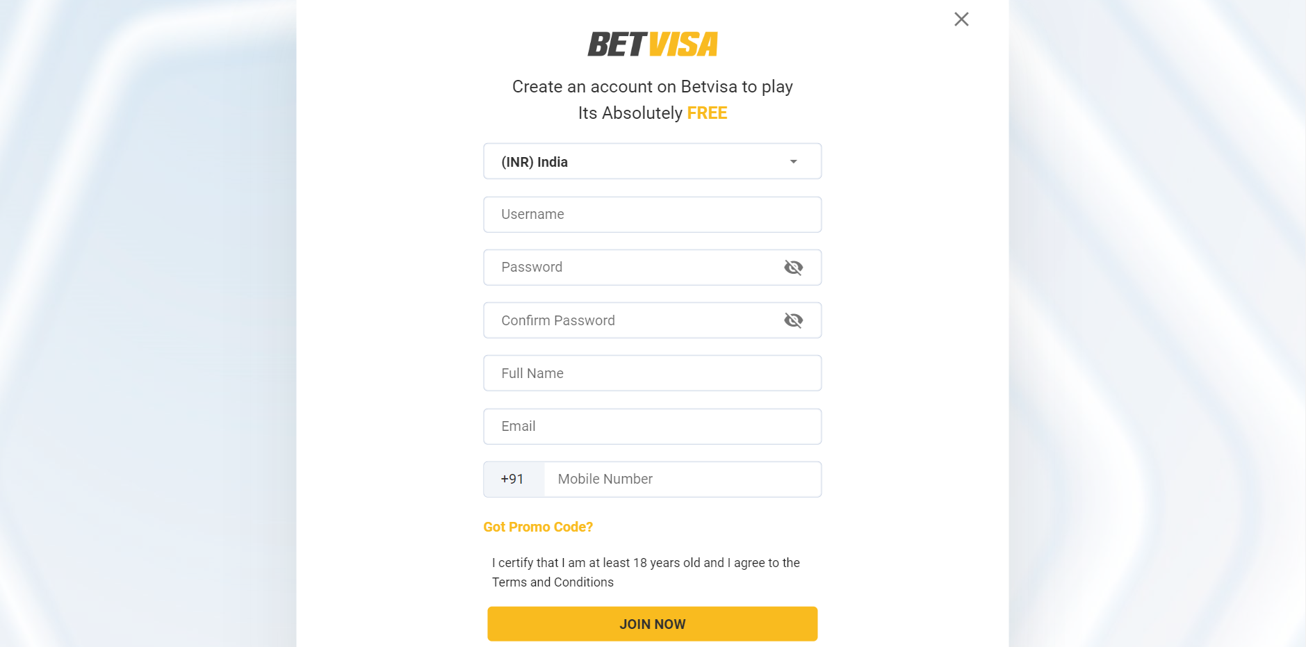 You can see the BetVisa Join Now button after visiting the official BetVisa sports betting website. You need to click on the button, to begin with the registration procedure. Click on Join Now to begin the process;