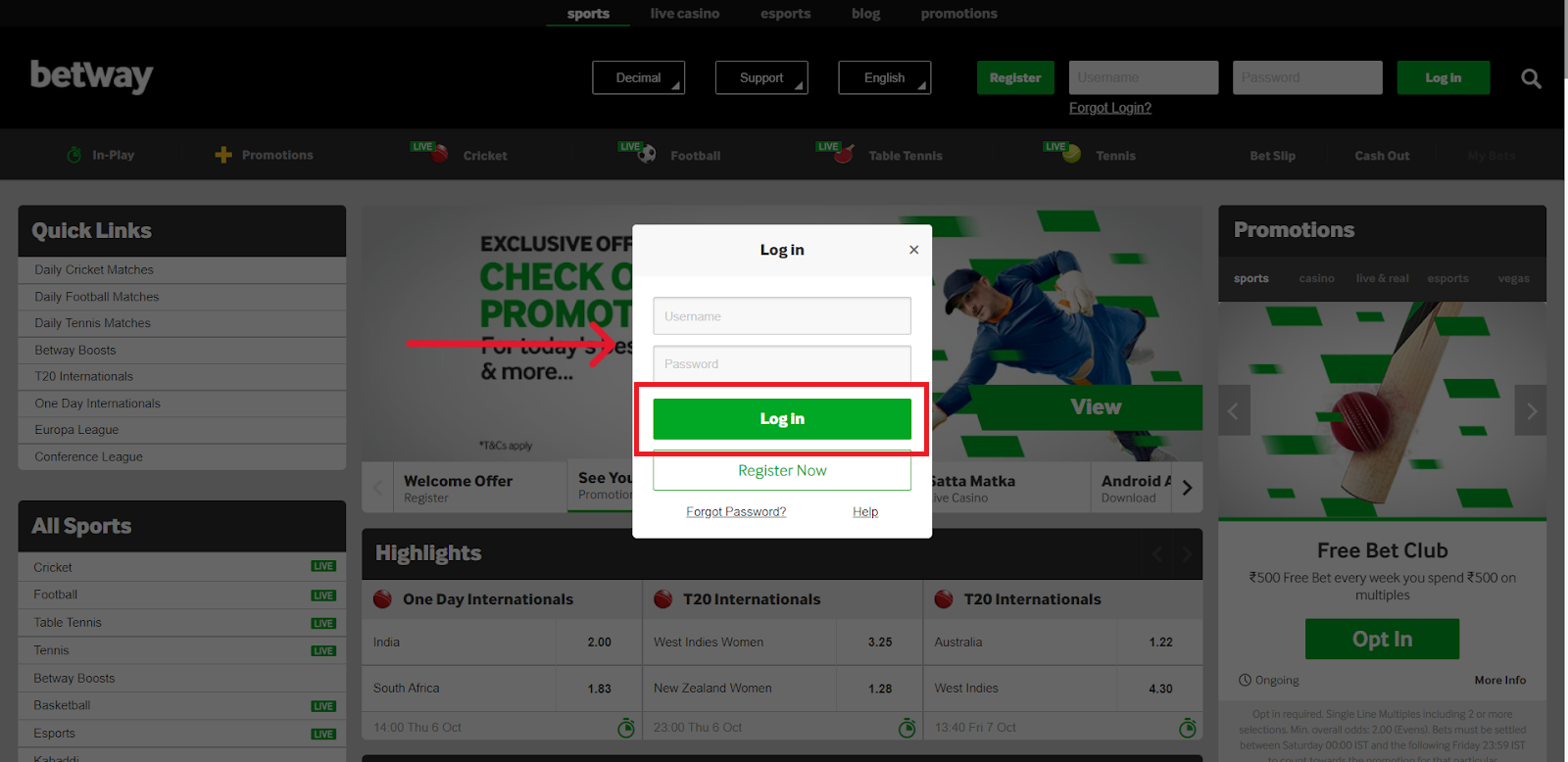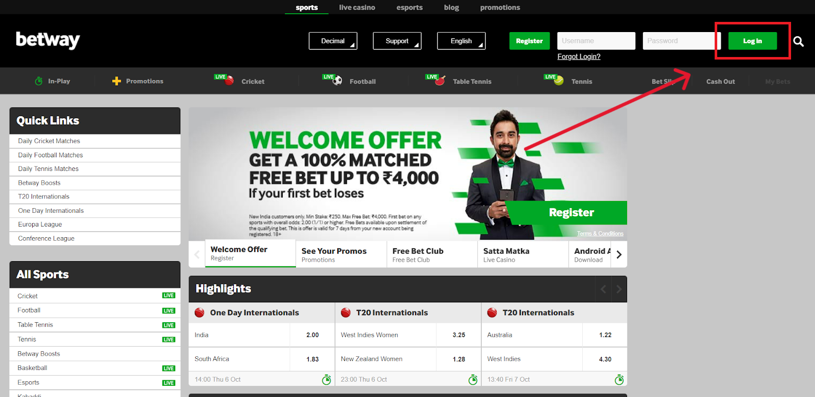 Click on the login option at the top right side to initiate the login procedure. Fill in the username and password entered at the time of registration to log in to your Betway account;
