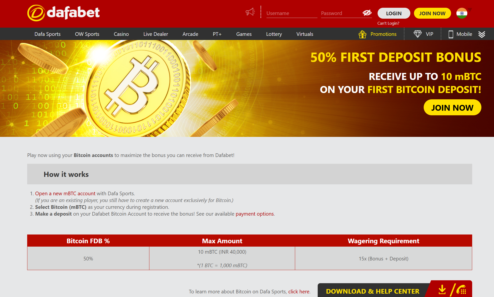 Create a new Bitcoin (mBTC) account with Dafabet to receive a 50% welcome bonus up to 10 mBTC (INR 40,000). Make a deposit and meet a 15x wagering requirement to withdraw. Available only for Bitcoin account holders.