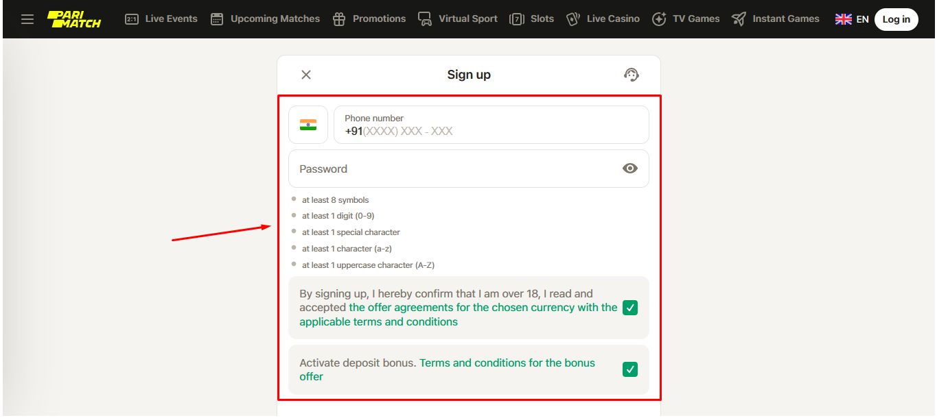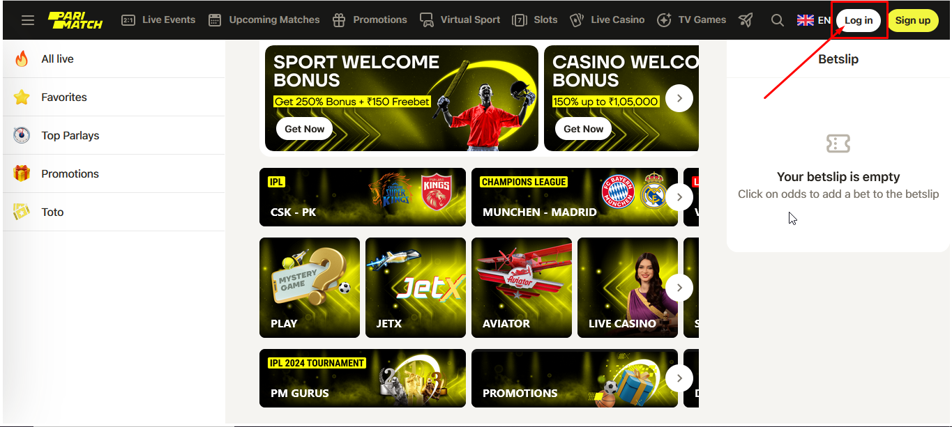 To bring the Parimatch India sportsbook login procedure to a finish, tap on the Login menu tab.