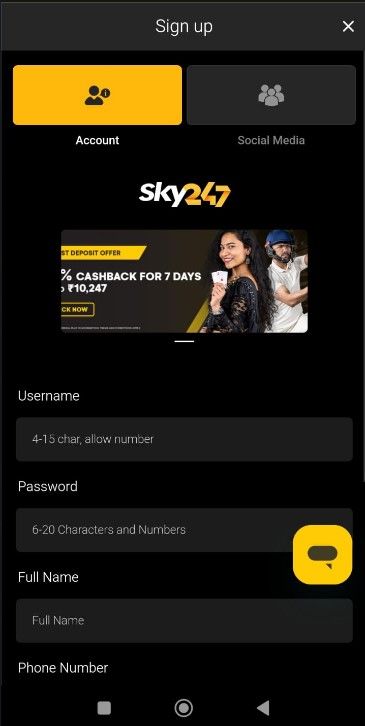 Account creation on Sky247 mobile application is effortless. Follow these steps to create an account on the app: