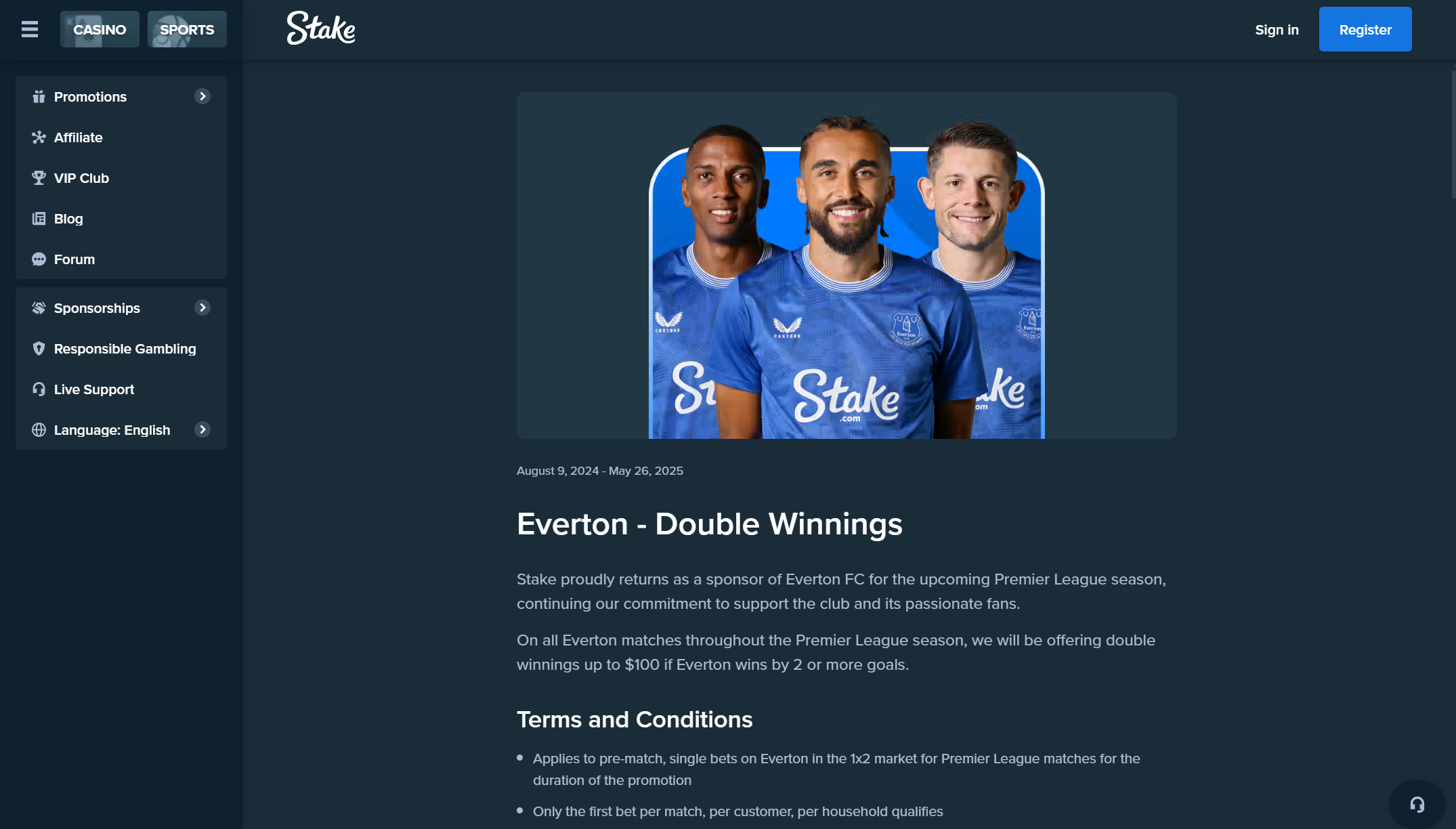 Stake returns as Everton FC’s sponsor for the Premier League season. Bet on Everton in the 1x2 market, and if they win by 2+ goals, you'll earn double winnings up to $100. Applies to pre-match, single bets. Minimum stake $5.