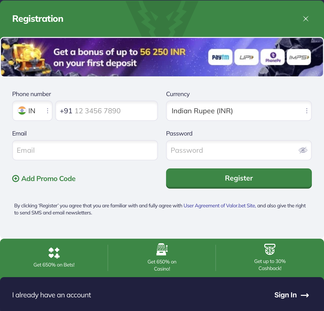 Valor Bet has a simple and straightforward registration procedure that can be completed in a jiffy. Since it caters across geographical regions and reaches a wide variety of populations, the registration platform is user-friendly and intuitive. Just follow the steps below: