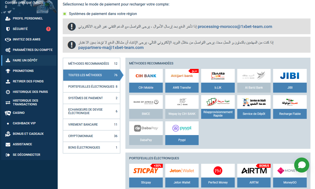 Pour recharger votre compte sur la plateforme 1xBet au Maroc via l'application APK, une variété de méthodes de dépôt est disponible, parfaitement adaptées aux réalités locales : des virements bancaires et paiements en espèces aux portefeuilles électroniques et à la cryptomonnaie. Toutes ces options supportent le dirham marocain (MAD), avec un dépôt minimum à partir de 10 MAD et un traitement instantané dans la plupart des cas. Voici les principaux choix, regroupés par catégories pour plus de clarté: