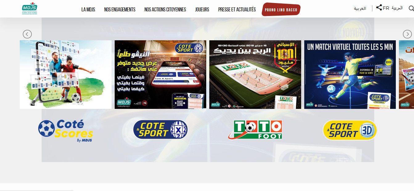 Fondée en 1962, la Marocaine des Jeux et des Sports (MDJS) est une entreprise publique chargée de la gestion exclusive des paris sportifs sur l'ensemble du territoire national Marocain, y compris les compétitions virtuelles, à l'exception des courses de chevaux, et de lévriers.