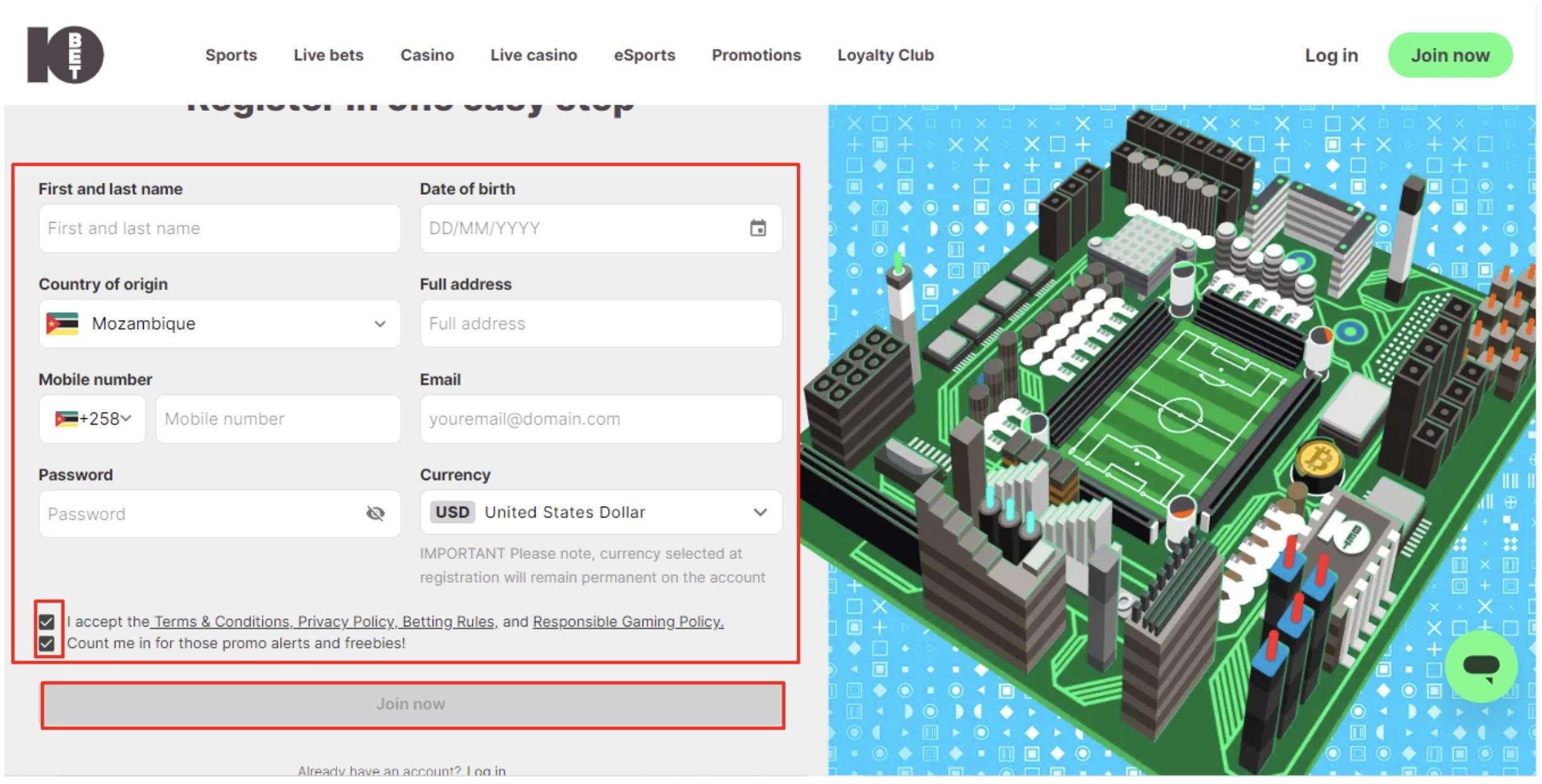 - Aceder ao site oficial da casa de apostas 10bet e clicar em “Join now”;