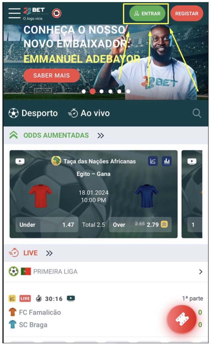 - Entrar no site ou na aplicação da 22Bet e clicar no botão “Entrar”;