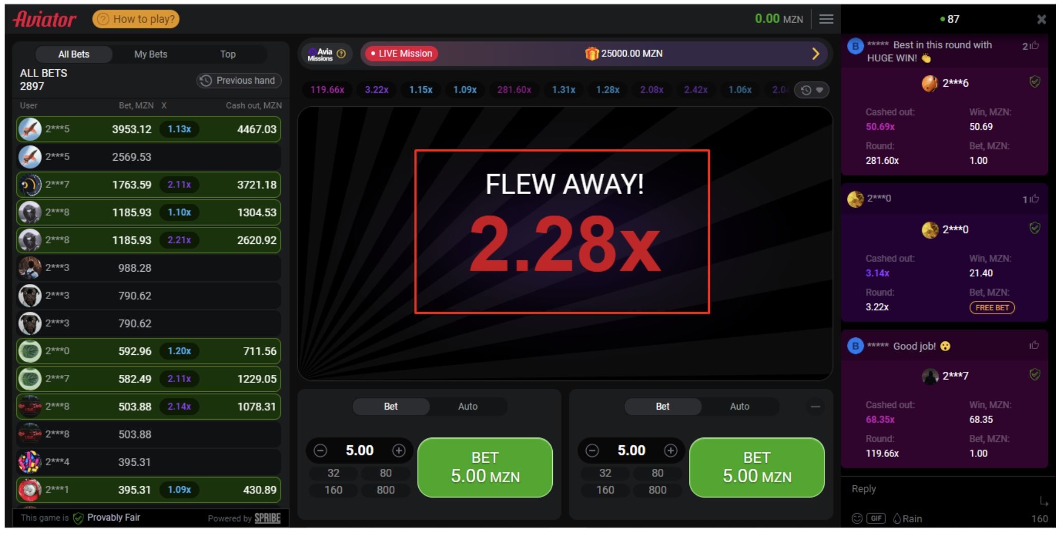 Cada ciclo do Aviator Bacelabet é limitado entre dois números. Antes de iniciar um ciclo, os jogadores apostam entre 1 e 50.000 meticais em uma ou duas opções. Durante a rodada, o valor da aposta é multiplicado pelo coeficiente, e os jogadores podem retirar os seus ganhos antes do avião partir.